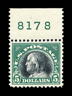 1930 nh 524 image#524, $5.00 Deep green and black, select top sheet-margin plate no. 8178 single, exceptionally fresh and bright, intense colors, well centered, o.g., n.h., extremely fine; 1980 PF certificate; ex-Floyd.. (Image) 400.00