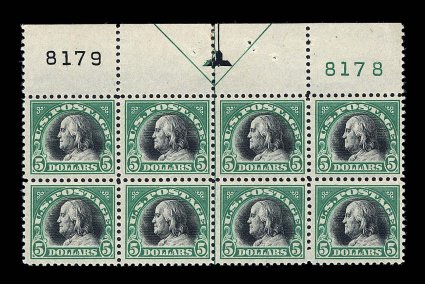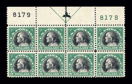 1931 nhPB 524 image#524, $5.00 Deep green and black, full top arrow and plate nos. 8179, 8178 block of eight, lovely rich colors, nicely centered, o.g., n.h., a couple minor gum skips and very slightly short gum at top, reinforced perfs. at top middle, a very fine example of this scarce and popular plate block. (Image) $6,400.00