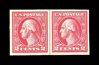 1937 nh 533 image#533, 2c Carmine offset imperforate, Ty. V, horizontal pair with vertical guide line between, large margins all around, strong rich color, pristine o.g., n.h., extremely fine; photocopy of a 1992 PF certificate for a block of four, this being the top pair. . (Image) $450.00