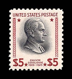 2002 nh 834a image#834a, $5.00 Red brown and black error of color, a brilliantly fresh and choice mint example of this truly rare and popular color error, possessing a wonderful overall brilliance, with intense rich colors, wonderfully well centered, pristine o.g. without the typical gum skips, never hinged, extremely fine; photocopy of a 1996 PF certificate for a top sheet-margin block of four, this being the bottom left stamp in the block; the intact block from which this stamp originated was signed by Sloane in the top sheet margin, and the top right stamp was retained by the Philatelic Foundation as their reference comparison copy; plus a 1999 PF certificate as a single. (Image) $3,000.00
