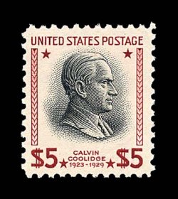 2003 og 834a image#834a, $5.00 Red brown and black error of color, handsome mint example of this rare and popular error of color, deep luxuriant colors, well centered, o.g., barest trace of hinging (if at all), very fine and quite choice; signed lightly in pencil by George B. Sloane and accompanied by a 1958 PF certificate. (Image) 2,000.00