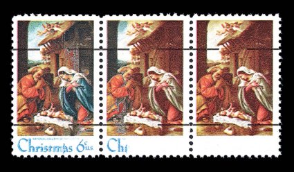 2005 nh 1414c image#1414c, 6c Christmas, Blue omitted, pre-cancelled as always, in a transitional strip of three, the left stamp normal, the middle stamp with partial blue printing, and the right stamp with blue printing completely omitted, o.g., n.h., trivial gum disturbance on the left (normal) stamp only, very fine; only a few of the 15 reported examples exist in this transitional format. (Image) $1,500.00+