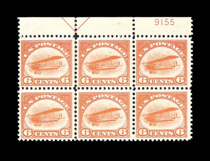 2011 nhPB C1 image#C1, 6c Orange, choice top margin arrow and plate no. 9155 block of six, exceptionally fresh, possessing brilliant vivid color, unusually well centered, pristine o.g., n.h., lacking the gum flaws that are found on so many, extremely fine; a most attractive plate block. (Image) $1,050.00