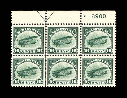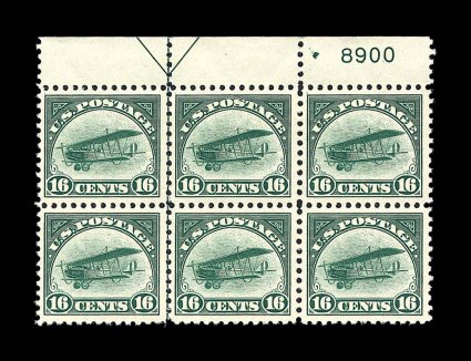 2014 nhPB C2 image#C2, 16c Green, top margin arrow and plate no. 8900 block of six, exceptionally fresh, with deep rich color and a crisp impression on bright white paper, very well centered, o.g., n.h., top left stamp with small natural gum skip, usual light flat plate gum bends, very fine; an especially scarce plate block in this premium condition. (Image) $1,500.00