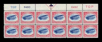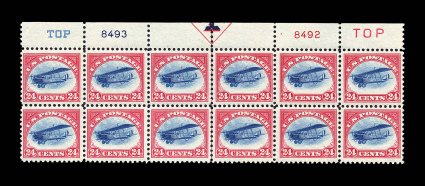 2018 nhPB C3 image#C3, 24c Carmine rose and blue, top margin arrow, two "TOP" and plate nos. 8493, 8492 block of twelve, bright colors, o.g., n.h., usual natural gum bends and skips, fine-very fine. (Image) $2,000.00