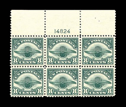 2019 nhPB C4 image#C4, 8c Green, select full top margin plate no. 14824 block of six, exceptionally well centered throughout, strong deep color on bright paper, o.g., n.h., extremely fine. (Image) $325.00