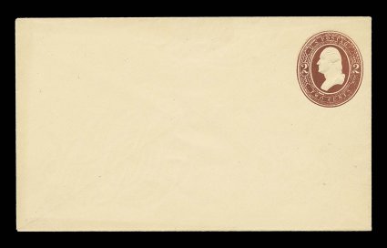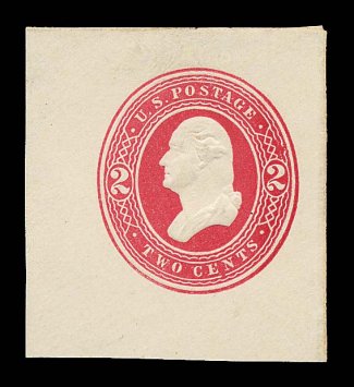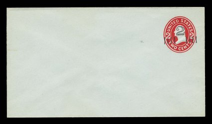 2216 ogc U358 var. image#U358 var., 2c Carmine on white, die 99, size 10, knife 54, wmk. 12, beautifully fresh mint entire of this incredibly rare envelope, brilliant color on bright white paper, plus exceptionally sharp embossing, extremely fine in all respects; this differs from the more common envelopes of this type being watermark 12 rather than 13, the UPSS catalog specifically notes that there are only three examples of this rarity known and this is the first example that we have had the pleasure to offer; ex-Stone, White (Image) UPSS $2,500.00