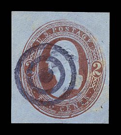 2204 O U275 image#U275, 2c Brown on blue, round "O" in "TWO", attractive used example of this exceptionally rare cut square, measuring 29x33mm, bold target cancel, few light spots of discoloration to the blue paper, barely detracting, otherwise very fine; this is one of the most elusive postal stationery items with no mint entires or cut squares known, only seven used cut squares have been recorded, an elusive and key issue for completing a cut square collection. (Image) $20,000.00