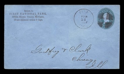 2207 c U308 image#U308, 2c Green on blue, die 87, size 10, knife 54, wmk. 7, a remarkably rare used entire being one of only two known examples, while mint cut squares, which are also rarities, are known, no mint entire has been discovered, quite fresh and possessing the corner card of the First National Bank of Ovid in the county of Clinton, Michigan, "Ovid/Mich./Sep 28 1887" c.d.s. with crossroads cancel, this being the earliest known usage, the other dated October 17, 1887, backstamped Chicago the next day, very fine and a choice example of this postal stationery rarity; ex-White (UPSS #920). (Image) $20,000.00