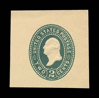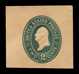 2208 og U309 image#U309, 2c Green on manila, an exceptionally rare mint cut square, being a full corner measuring 42x38mm, strong color on distinctive manila paper,crisp embossing, very fine and choice; this is only the third mint example that we have ever offered of this elusive cut square, the other two include a smaller example with stains, plus a slightly larger, but very similar, full corner in our June 2000 sale of the marvelous collection of cut squares formed by Dr. Jerry Summers, his example realized $20,900.00 versus a then catalog value of $4,500.00, this represents a rare second opportunity to acquire a premium example of this key cut square. (Image) $17,500.00