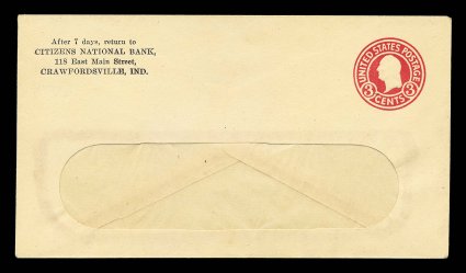 2218 ogc U437g image#U437g, 3c Carmine on amber, error of color, die 5, UPSS die 144, size 10, knife 58w, wmk. 19, mint entire of this striking color error, only comes in this one type of window envelope with Citizens National Bank of Crawfordsville, Indiana corner card, very fine (UPSS #2529). (Image) $525.00