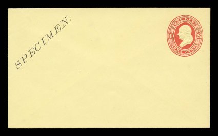 2261 Sc UO45 image#UO45, 1c Red War Dept. on amber, die WD10, size 7, knife, wmk. 2,exceptionally clean and attractive entire with "Specimen" overprint at top left, (form 17) leaving the indicia well clear for a large gem full corner cut square, bright colors, strong embossing shows great detail, extremely fine; a rare entire that only comes with "Specimen" and from which the few cut squares have come; ex-Barkhausen (UPSS # WD51). (Image) for cut square $1,000.00