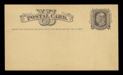 2272 ogc UX4 var. image#UX4 var., 1c Black on buff, watermark reversed, fresh mint example of this watermarked card that is particularly elusive in mint condition, possessing a rarely seen strong watermark, very fine; the Postmaster General authorized the discontinuance of watermarked paper with this issue but a small quantity of the watermarked paper was left over and used up before the unwatermarked paper was placed in use explaining the rarity of this card, in addition the watermark is usually very faint and often only barely visible, a card showing it as strongly as this example so that the position of the watermark can be easily determined is extremely rare; this is the first mint card with reversed watermark we have offered and only the second mint card that we have ever offered of this rare issue (UPSS #S3b). (Image) $2,500.00