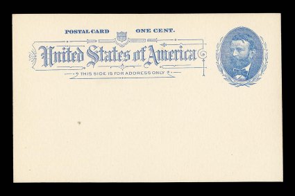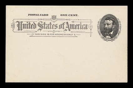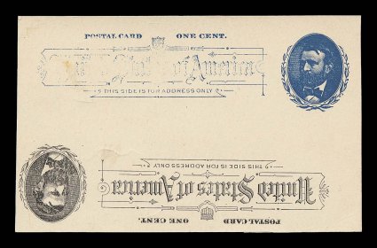 2274 Pc UX11P image#UX11P, 1c Grant postal card, double impression, one in black and one in blue with one inverted, properly classified as printer's make-ready, printed in black when the black proofs were being printed and the sheet not accepted, so the sheet was used again to save paper when the printers were getting the press ready to print the issued cards in blue, strong impression of the blue Grant vignette, but weak impression of the blue imprint testifying to the press preparations that were being made, a handsome and scarce item for the postal card collector. (Image) Est. 200-300