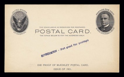 2276 PSc UX17P image#UX17P, 1c Black, "Full Face" McKinley with die proof imprint at bottom, crisp and attractive proof card with incredibly rare "SPECIMEN-Not good for postage" grey black handstamp, very fine and choice; several specimen designations are known on cards both with and without the proof imprint at bottom, all are rare, only four examples of this type are known, this being the first example that we have ever offered (UPSS #S21-Sp4). (Image) Est. 2,000-3,000