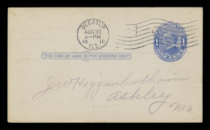 2277 Oc UX21e image#UX21e, 1c Blue on bluish, with the four arcs above and below "IS" pointed, clean used card with attractive Decatur, Ill. flag cancel, displaying the USPCC "Type I" variety of this rarity (a gap at the lower left corner of the "D" in "SIDE"), choice very fine; legend has it that this variety is a result of removal of one of the original 48 subject plates, in order to produce a master die for #UX22, a new plate was hastily recut from a previously rejected example and substituted into service, giving rise to the "pointed arcs" variety, in fact two different positions show this variety accounting for the two types, neither of which appears on the market with any regularity (USPCC #S28f, Type I). (Image) $600.00