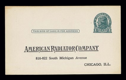 2278 ngc UX27D image#UX27D, 1c Green on gray, rough surfaced card, die II, crisp unused entire, preprinted "American Radiator Company" address on front with printed questionaire on reverse, very faint aging at extreme top edge, very fine and scarce (USPCC #S39). (Image) $375.00