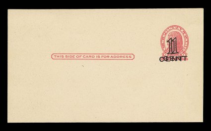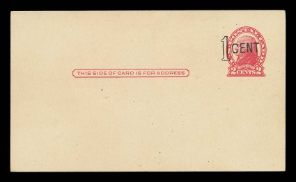2279 ogc UX31 image#UX31, "1 cent" surcharge on 2c Red on cream, a premium mint example of the so-called "one-line surcharge" rarity, wonderfully fresh with sharp full corners, extremely fine; one of the most desired of all U.S. postal cards, this first surcharge die, which was used experimentally in Washington, D.C. only, was deemed unsatisfactory and immediately withdrawn; 2003 PF certificate (USPCC #S43). (Image) $5,000.00