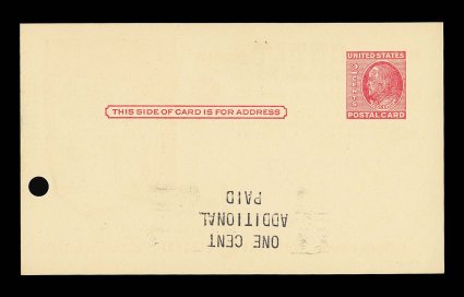 2281 ngc UX47 var. image#UX47 var., "One Cent/Additional/Paid" surcharge on 2c Carmine, inverted surcharge at bottom left, fresh unused card with the General Electric advertisement print on the reverse, so-called "G-E" type 2 surcharge inverted at bottom, a select fresh example of this error, with punch hole at left as all have, extremely fine (UPSS #S64-2f). (Image) $500.00