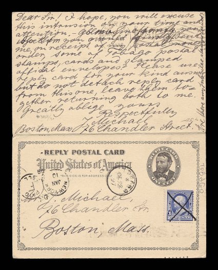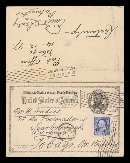 2282 c UY1 image#UY1, 1c + 1c Black postal reply card, used with 1c Blue (#219), tied by Oct. 16, 1897 Boston flag machine cancel and sent to Tobago, with New York transit and Nov. 12 Tobago receiver, the reply portion also has the 1c Blue stamp tied by ms. "X" and postmarked with Tobago Dec. 22, 1897 c.d.s., New York Paid All and Boston Jan. 11 receiver, fine; a rare foreign usage of the reply card. (image 2282a) (Image) Est. 200-300