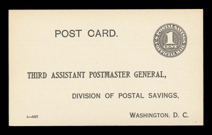 2283 ngc UZ1 var. image#UZ1 var., 1c Black official, crisp unused card prepared for postal savings reporting by the Post Office Department, all "mint" cards are pre-printed, this one showing the plate variety of short second "A" in "Assistant", very fine and scarce as few unused examples reached the public (UPSS #O1b). (Image) $550.00