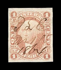 2285 O R4a image#R4a, 1c Telegraph, imperforate, very large and even margins all around, 1864 ms. cancel, extremely fine. (Image) $525.00