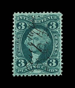 2286 O R17c image#R17c, 3c Playing Cards, a used single which possesses the finest centering we have encountered on this terribly difficult stamp, with large well balanced margins all around, plus its color is particularly rich and intense, neat 1864 ms. cancel, extremely fine; a true condition rarity whose catalog value does not accurately reflect its market value in this gem condition; 1995 PF certificate; ex-Yost. (Image) $150.00