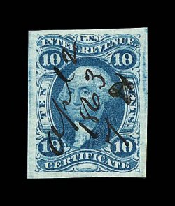 2287 O R33a image#R33a, 10c Certificate, imperforate, select used single, with four very large and perfectly symmetrical margins, rich luxuriant color, neat 1863 ms. cancel, an extremely fine gem; ex-Handy. (Image) $200.00