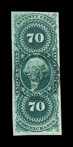 2288 O R65a image#R65a, 70c Foreign Exchange, imperforate, a gorgeous used single which features several outstanding physical characteristics, including four uniformly large and balanced margins, sumptuously rich color and a sharp impression, wonderfully cancelled with a socked-on-the-nose "Tho's. Richardson & Co./May 28/1864" c.d.s., extremely fine; an especially desirable stamp in this gem quality; ex-Handy. (Image) $450.00