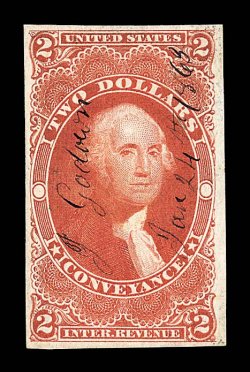 2289 O R81a image#R81a, $2.00 Conveyance, imperforate, premium quality used single, with four large and well balanced margins, deep luxuriant color, neat and unobtrusive 1863 ms. cancel, and extremely fine gem; 1996 PF certificate; ex-Lyons. (Image) $180.00