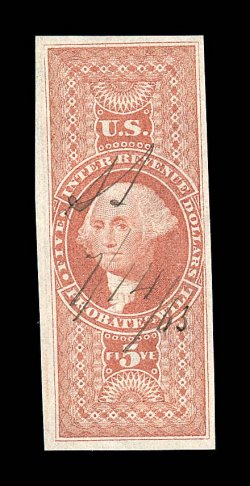 2290 O R92a image#R92a, $5.00 Probate of Will, imperforate, gem quality used example of this scarce stamp, featuring extra-large to huge margins all around, plus its color is richer and deeper than often encountered, strong impression on immaculate paper, very light and unobtrusive ms. cancel dated 1863, extremely fine; especially scarce and desirable in this select condition; 1995 PSE certificate; ex-Yost. (Image) $575.00