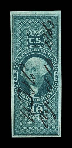 2291 O R93a image#R93a, $10.00 Charter Party, imperforate, handsome used example, with four large to very large margins, sumptuously rich color and impression, neat 1863 ms. cancel, extremely fine; a very scarce stamp in any condition, but particularly so both this choice and certified; 1998 PF certificate; ex-Yost. (Image) $700.00