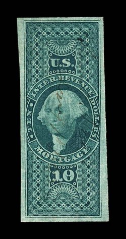 2292 O R95a image#R95a, $10.00 Mortgage, imperforate, a gem used example which possesses tremendous eye appeal, featuring extravagantly large margins all around, but equally impressive is this stamp's gorgeous intense color and a deeply etched impression, very light and nondistracting ms. cancel, extremely fine; a perfect stamp for the collector who seeks out their first issue imperforate revenue stamps in truly exceptional condition; 1995 PSE certificate; ex-Yost. (Image) $500.00