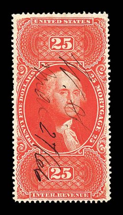 2293 O R100c image#R100c, $25.00 Mortgage, incredibly deep color and a remarkably vivid impression on fresh white paper, nicely centered, 1866 ms. cancel, very fine. (Image) $160.00