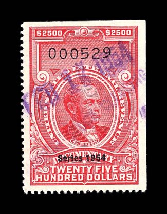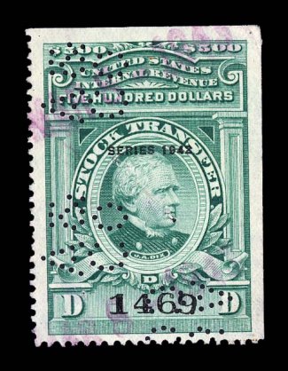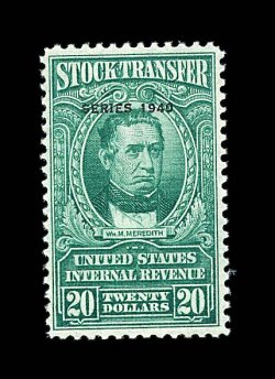 2297 O RD138 image#RD138, $500.00 Bright green, Series 1942, a choice used example of this immense stock transfer stamp rarity, with strong bright color, quite well centered, light violet handstamps as well as the usual perforated initials cancel, typical tiny staple holes at top and a truly insignificant corner crease, still very fine; it is believed that no more than five or six examples exist, making this one of the keys to completing the "dated" stock transfer series; 2002 PF certificate. (Image) $8,000.00