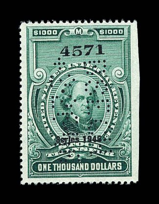 2298 O RD208 image#RD208, $1,000.00 Bright green, Series 1945, used, neat perforated initials, well centered, deep rich color, very fine; ex-Lyons. (Image) $240.00