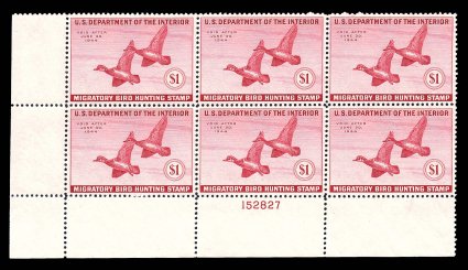 2300 nhPB RW10 image#RW10, 1943 $1.00 Deep rose, bottom left corner plate no. 152827 block of six, well centered, bright color, o.g., n.h., choice very fine. (Image) $625.00