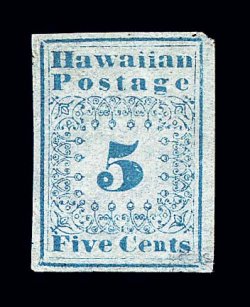 2321 ng 2 image#2, 5c Blue on pelure paper "Missionary", Ty. II, showing small "n" in "Cents", an enormously rare unused example demonstrating its outstanding quality by possessing four remarkably large and well balanced margins, magnificent pastel color and exquisite impression, the stamp's design has not been painted in unlike almost every other known unused copy, besides a few typical small faults which are endemic to these frail issues, there are small portions of the top right and bottom right corners which have been expertly added, extremely fine appearance; an historically exciting unused stamp, and of the mere twelve known unused Five Cent Missionaries this is, by far, the most superb appearing example, and among the finest of the ten available to collectors, as the other two reside in the Tapling Collection housed in the British Museum; 1944 APS and 2004 PF certificates; ex-Rider, Rust and Pietsch. (Image) 45,000.00