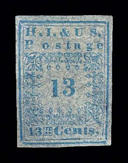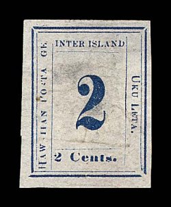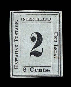2322 ng 4 image#4, 13c Blue on pelure paper "Missionary", Ty. II, "H.I. & U.S. Postage", a magnificent appearing unused example of this world-class rarity, featuring large and wonderfully well balanced margins all around, strong color and impression, with expertly repaired portions of the design and portions of the frame lines drawn in, as is typical of virtually every known Missionary, extremely fine appearance; one of only eight known unused examples of the Type II Thirteen Cent Missionary, and certainly one of the most beautiful appearing; of the eight examples recorded, only seven are available to collectors, as the eighth copy resides in the Tapling Collection housed in the British Museum; 1994 and 2004 PF certificates; ex-Lilly, Golden. (Image) 40,000.00