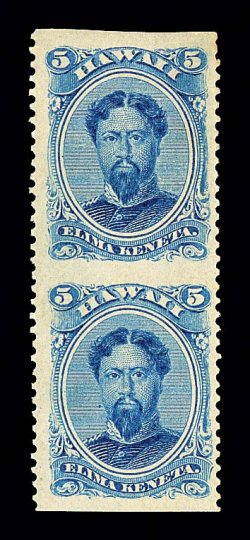 2326 og 39a image#39a, 5c Ultramarine, Die I, vertical pair, imperforate horizontally, far better centering than this error normally comes, fresh color, full o.g., h.r., miniscule corner perf. crease at top right of no importance, very fine; a highly desirable example of this important error rarity of Hawaii; 2004 PF certificate. (Image) $4,250.00