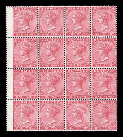 2381 og/nhbl S.G. #1 imageS.G. #1, 1p Rose red, an impressive mint block of sixteen with wing margin at left, bright and fresh color, uncommonly well centered, possessing full o.g. being hinged in the top row only, second horizontal row has a horizontal crease plus a gum bend in one other stamp, edge thin in the top left stamp, other stamps are very fine; a rare multiple and wonderful exhibition piece (Scott #1; for hinged $1,280.00+). (Image) for hinged £1,441+