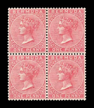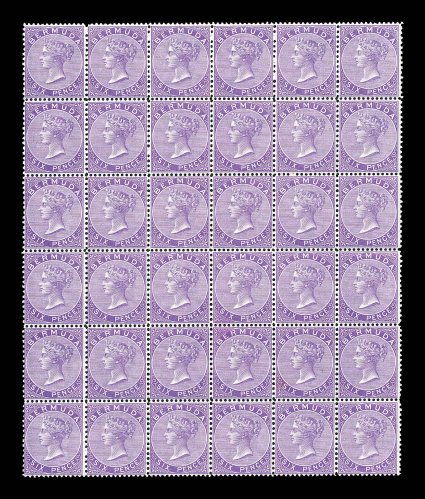 2382 nhbl S.G. #10a imageS.G. #10a, 1903 6p Bright mauve, perforated 14x12 1/2, an extraordinarily handsome and striking mint block of 36 (6x6), lovely bright color, magnificent centering especially for a block of this size, full original gum that has never been hinged, one stamp with spot of gum toning that is not apparent from the front, in all other respects very fine-extremely fine; while this is not a rare mint stamp, in an impressive mint multiple such as this, it has a place in any important collection of Bermuda (Scott #8; for hinged $540.00+). (Image) for hinged £468+
