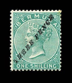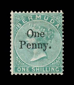 2386 og S.G. #17 imageS.G. #17, 1875 "One/Penny." surcharge on 1/- Green, mint single with bright green color, strongly struck and clear surcharge, o.g., fine and scarce; signed Senf (Scott #15; $500.00). (Image) £500