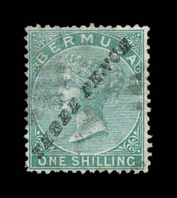 2384 O S.G. #13 imageS.G. #13, 1874 "Three Pence" surcharge Ty. 6 on 1/- Green, used single, quite well centered for this difficult issue, faint crease at left, otherwise very fine (Scott #12; $900.00). (Image) £850