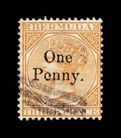 2385 O S.G. #16 imageS.G. #16, 1875 "One/Penny." surcharge on 3p Yellow buff, attractive used single with light grid cancel, strong bright color, well centered, fresh and very fine (Scott #14; $350.00). (Image) £350