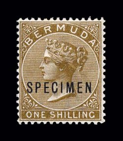 2387 S S.G. #21s, 26s, 29s imageS.G. #21s, 26s, 29s, 1892-93 1/2p Dull Green, 2p Aniline purple and 1/- Yellow brown overprinted "Specimen", cplt., being the three new values or colors of the Queen Victoria issue, lovely matched set, well centered, bright colors, o.g., extremely fine (Scott #18aS, 21aS, 25aS). (Image) £375
