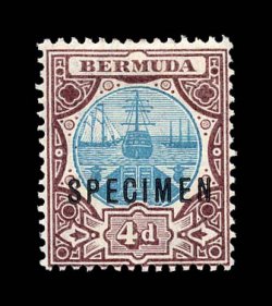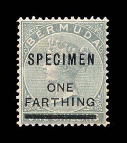 2388 S S.G. #21s, 26s, 29s, 30s imageS.G. #21s, 26s, 29s, 30s, 1892-93 1/2p Dull Green, 2p Aniline purple and 1/- Yellow brown overprinted "Specimen", cplt. plus "One/Farthing" surcharge on 1/- Dull grey with "Specimen" overprint, fresh bright colors, o.g., minor h.r., fine-very fine (Scott #18aS, 21aS, 25aS, 26S). (Image) £450