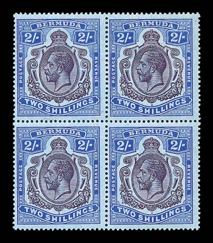 2394 og/nhbl S.G. #51b, 51be imageS.G. #51be, 1920 2/- Purple and blue on blue, break in lines below left scroll, variety is found in the bottom left stamp of a mint block of four, positions 33-34/46/46, strong deep colors, o.g., three stamps n.h. including the variety, fine-very fine (Scott #49, 49 var.). (Image) for hinged £279+