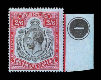 2395 og S.G. #52a imageS.G. #52a, 1918 2/6 Black and red on blue, break in scroll, position 12, mint single with portion of right sheet margin showing the plate no. 1, rich colors, o.g., few flecks of perf. tip toning not apparent from the front, fine (Scott #50 var.). (Image) £300