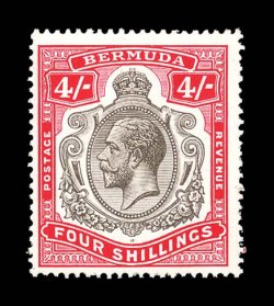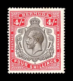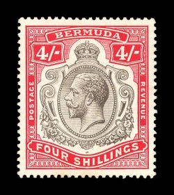 2396 og S.G. #52ba imageS.G. #52ba, 1920 4/- Black and carmine, break in scroll, position 12, attractive mint single with bright colors, o.g., l.h., very fine (Scott #51 var.). (Image) £275